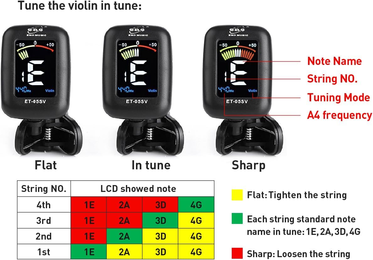 Introducing the ENO MUSIC Professional Violin Viola Tuner, the ultimate tool for tuning your violin or viola with precision and ease. This clip-on tuner features a colorful LCD display that provides clear and accurate tuning information at a glance.